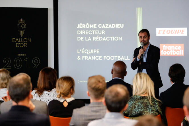 Jérôme Cazadieu,alors directeur éditorial de « L’Equipe » et de « France Football »,lors d’une conférence de presse de présentation du trophée du Ballon d’or,à Paris,le 19 septembre 2019. THOMAS SAMSON / AFP « Ce sont des méthodes mafieuses. » Ce 11 juillet,devant le juge d’instruction Vincent Lemonier,l’ex-directeur de la rédaction du journal L’Equipe (2015-2023) Jérôme Cazadieu ne mâche pas ses mots au sujet de ces faux comptes,sur le réseau social X,créés et animés par une agence de communication,de 2018 et 2020,à la demande de la direction du Paris Saint-Germain (PSG),dans le cadre d’une campagne de calomnies en ligne.
