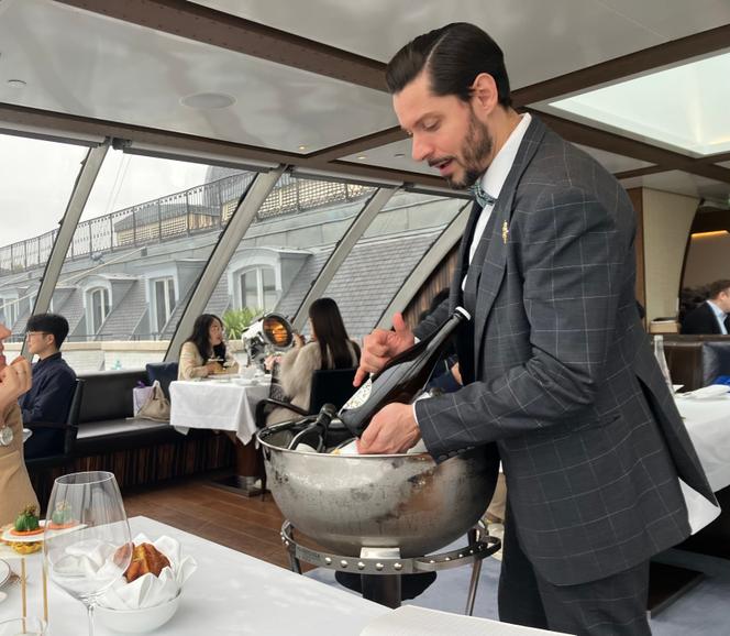 Impeccable dans son costume trois pièces en tartan,Florent Martin,le sommelier,guette la prochaine commande,une main sur son chariot de service. Mais ce ne sera peut-être pas un champagne ou un bourgogne. « Je viens de servir à cette dame un kombucha à la feuille de clémentine »,souffle-t-il. « Quand je passe à une table,je présente nos vins,mais aussi nos boissons sans alcool,et cela plaît de plus en plus »,confie ce sommelier chevronné,lauréat de multiples concours dans son domaine.