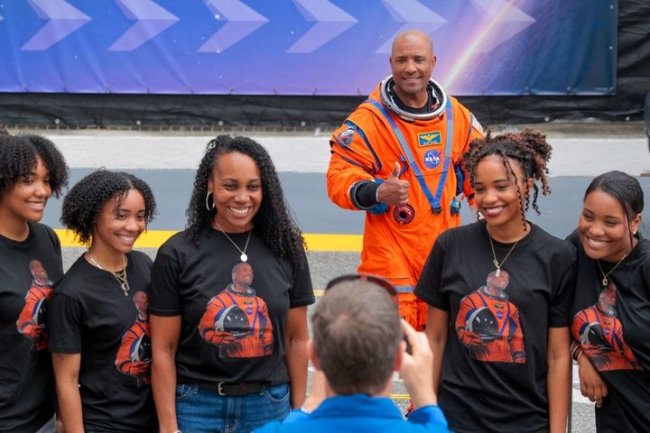 L'astronaute américain Victor Glover pose avec sa femme et ses quatre filles,avant le départ de la mission Artemis II,le 1er avril 2026. (CHIP SOMODEVILLA )